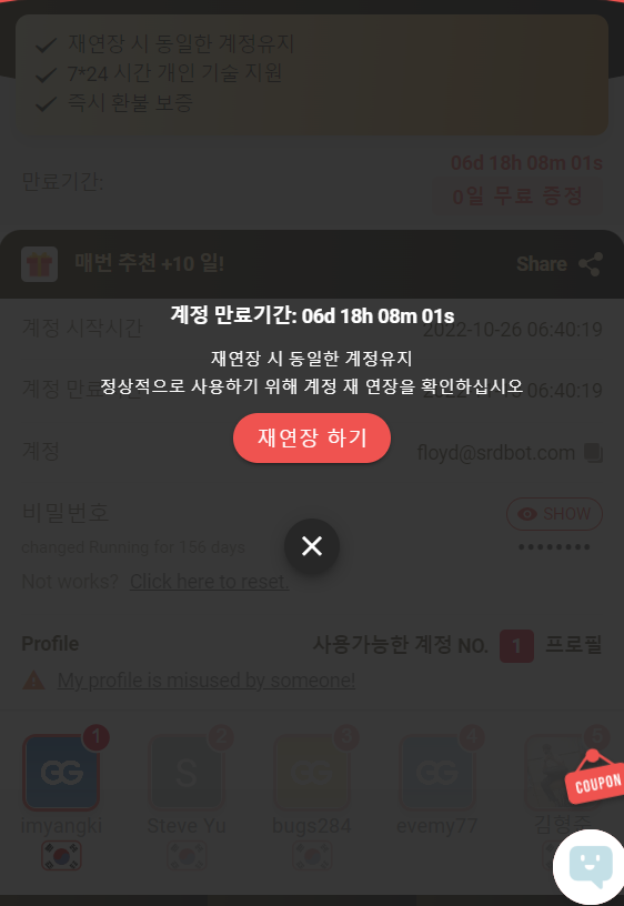 구매 후에는 위와 같이 바로 계정을 확인할 수 있답니다. 제가 사용하게 되는 프로필 넘버도 1번으로 나와서 공유하는 다른 사람들과 프로필이 사용될 일도 없답니다. 또한, 가장 걱정되는 부분이 바로 비밀번호가 변경되었을 경우인데요. 겜스고(Gamesgo)는 비밀번호를 리셋할 수 있고, 모든 사용자의 비밀번호가 리셋되기 때문에 공유된 계정을 편하게 사용할 수 있답니다.
