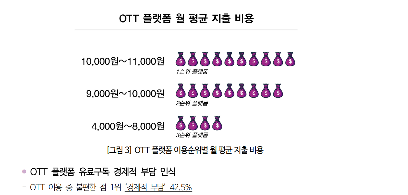 콘텐츠 진흥원에 나온 자료를 보아도 OTT 이용자들은 평균 2.7개의 플랫폼을 구독하고, 월평균 1만 3212원 지불하고 있답니다. 정말 매월 적지 않은 돈을 OTT 구독 비용으로 지불하고 있다는 것입니다.