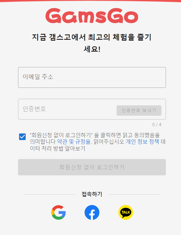 겜스고(Gamesgo)의 좋은 점은 특별한 회원 가입절차가 없다는 것입니다. 구글, 페이스북, 카카오톡을 연동해서 로그인할 수도 있으며, 이메일 주소만 인증해도 쉽게 로그인할 수 있답니다.