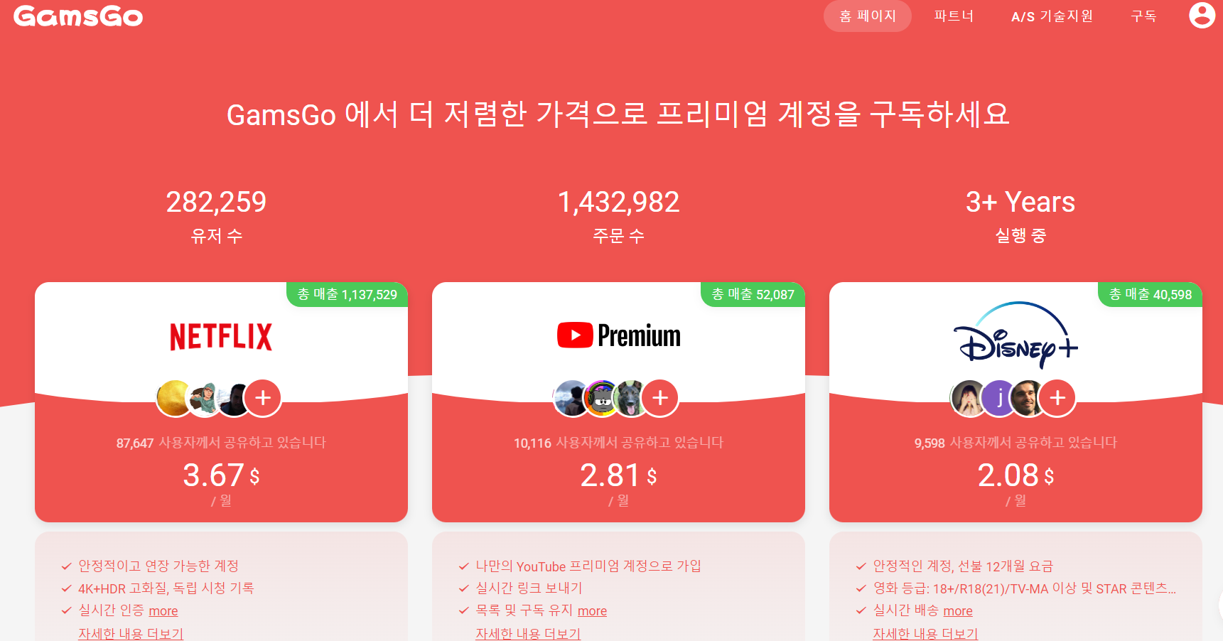 겜스고(Gamesgo)는 구독 소유자와 공동 구독자를 연결하여 비용을 절감할 수 있는 구독 공유 웹사이트입니다. 겜스고(Gamesgo)는 카풀 철학을 통해서 구독의 세계를 확장하고 있다는데요. 지난 3년이라는 기간 동안에 수십만 구독자들과 함께 구독 서비스를 공유하고 성장해 왔다고 합니다.