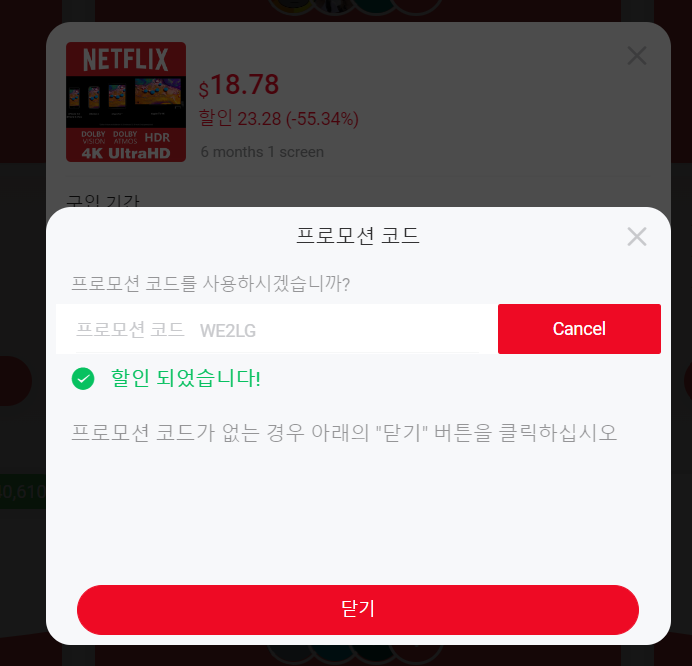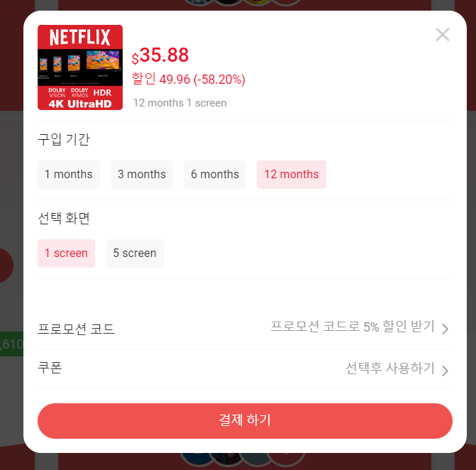 넷플릭스 결제 시에는 1개월, 3개월, 6개월, 12개월을 선택할 수 있으며, 추가로 할인을 더 받고 싶다면 프로모션 코드에 할인 코드만 입력하면 추가 5% 할인을 더 받을 수 있답니다.