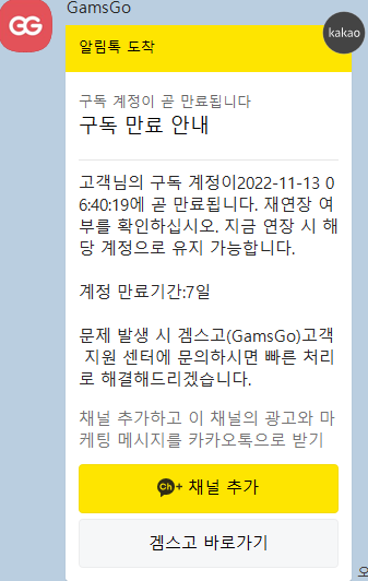 그리고 계정 만료기간을 앞두고는 겜스고(GamesGo)에서 바로 알림을 통해서 알려주기 때문에 혹시라도 놓치게 될 구독 일정을 놓칠 일도 없답니다.
