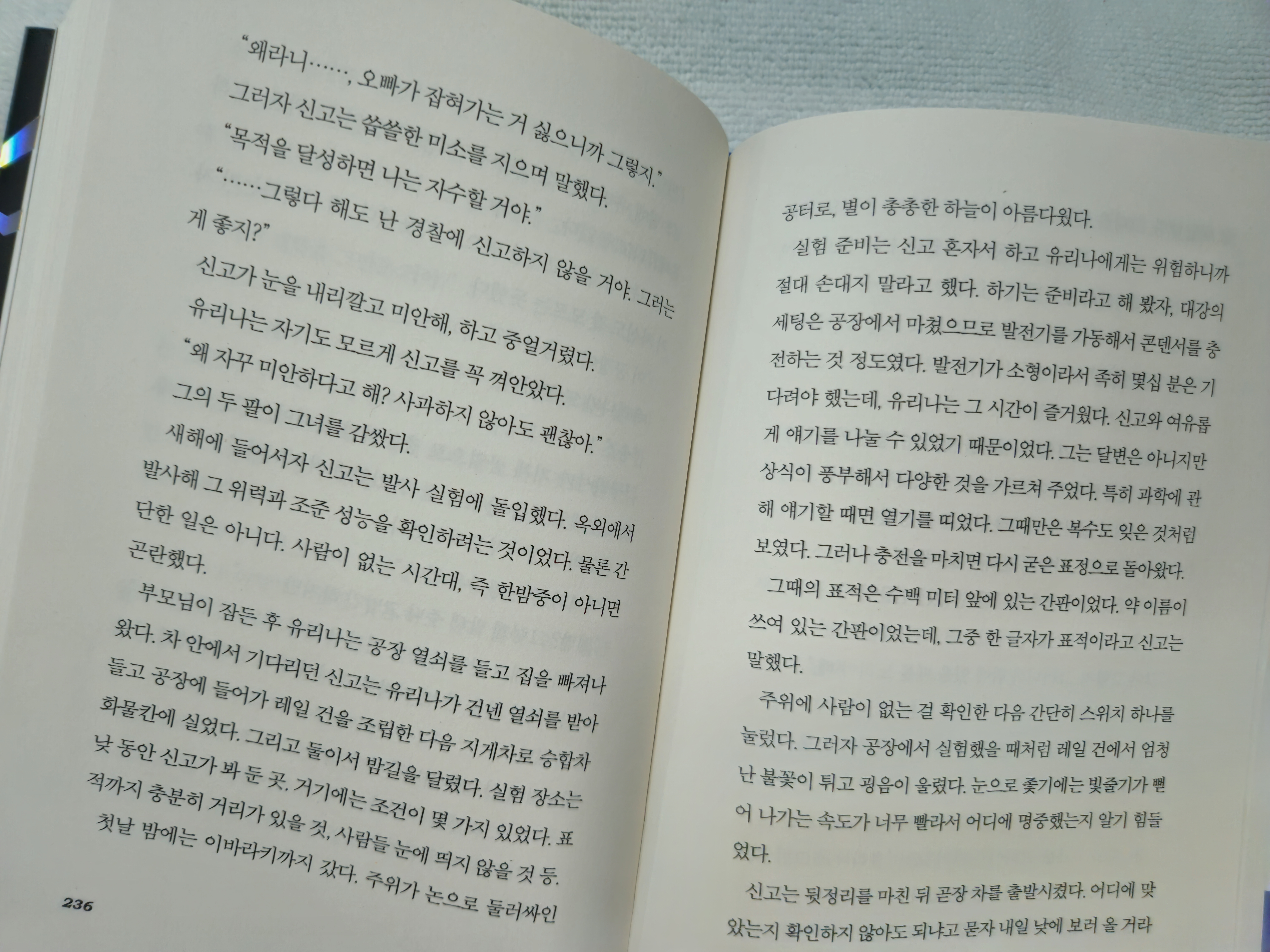 앞으로도 또 소설을 읽어볼 계기가 있을지 모르겠지만 이번 소설을 읽고 난 이후에 히가시노 게이고의 <나미야 잡화점의 기적>은 찾아서 읽어보거나 영화를 보고 싶다는 생각이 무척 들었습니다. 히가시노 게이고라는 작가의 매력을 알게 된 거 같은데요. 특히 이번 소설은 지금과 같은 과학을 맹신하는 시대에 과학은 인류에게 무한한 가능성을 제공하지 마, 그 힘을 어떻게 사용할지에 대한 고민을 해봐야 한다는 메시지를 담아서 더 좋았습니다. 오랜만에 마지막까지 몰입감 있게 책을 읽을 수 있었던 거 같아 너무 좋았던 소설이었습니다.