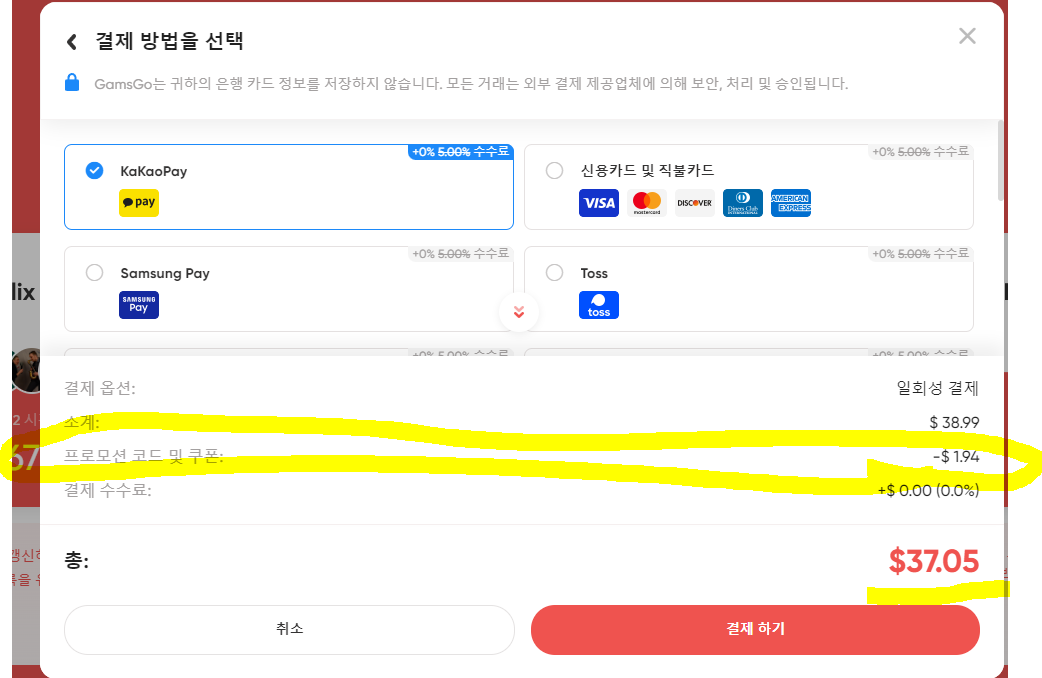 할인코드가 적용이 되어 1.94$가 할인이 되었네요. 최종 결제금액은 38.99$에서 37.05$가 되었습니다!