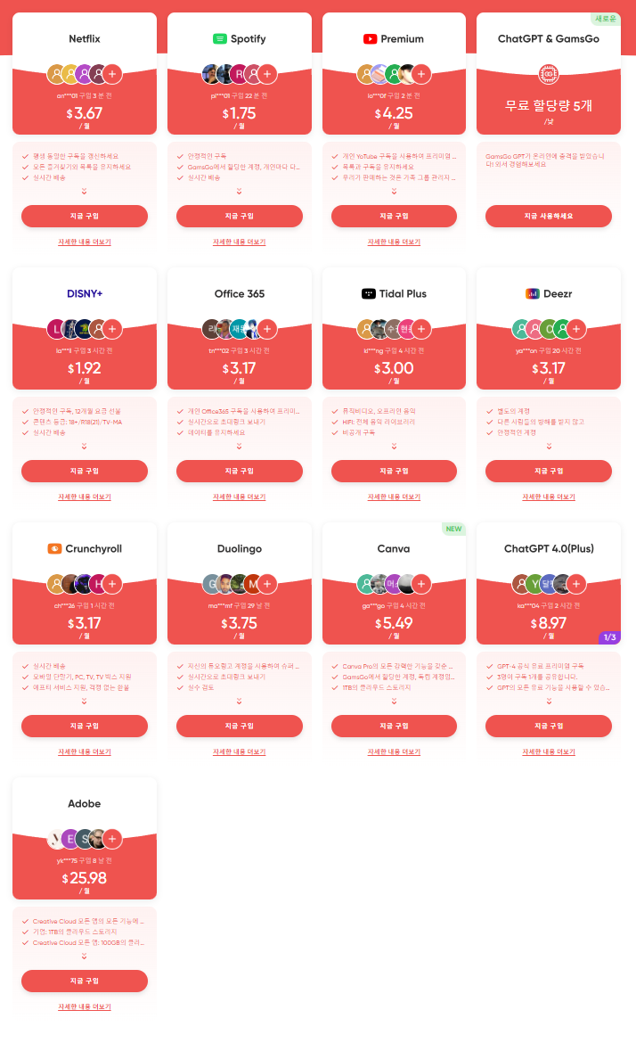 사이트에 가면 넷플릭스, 스포티파이, 유튜브프리미엄, 디즈니플러스, 오피스 365, 챗GPT까지 정말 많은 구독 서비스를 지원하는 걸 볼 수 있답니다.
