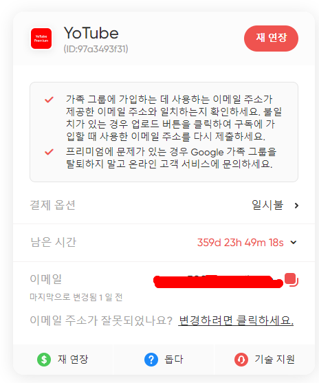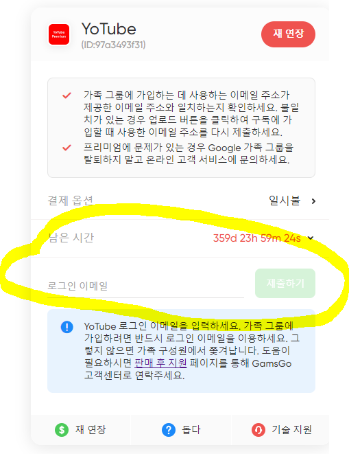 결제를 하고 나면은 본인이 사용하고 있는 유튜브 이메일을 제출해야 하는데요.