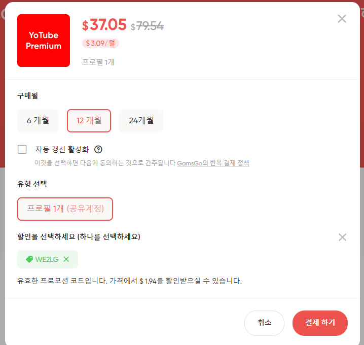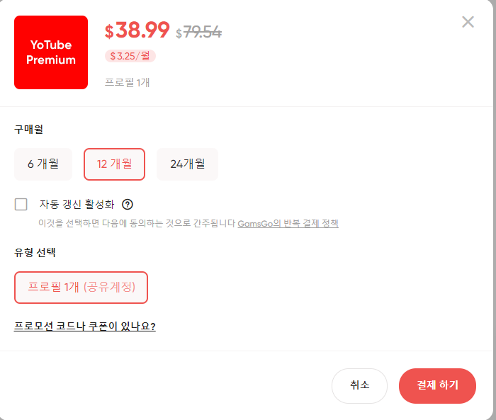 유튜브는 보는 것처럼 6개월, 12개월, 24개월 선택할 수 있는데요. 특이하게도 12개월로 결제하는 게 가장 저렴한 거 같더라고요. 12개월 기준 가격을 보면 한 달 기준 3.25달러인데요. 12개월로 계산하면 38.99달러입니다. 38.99달러는 현재 환율 기준으로 5만 4천 원 정도하고 있는데요.