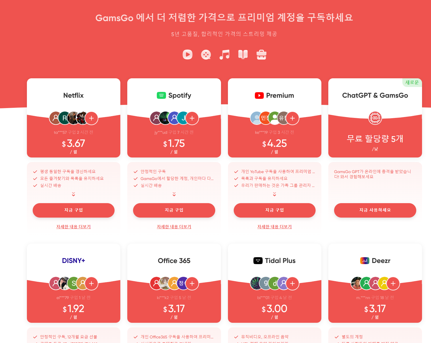 겜스고를 소개하자면 겜스고(Gamesgo)는 구독 소유자와 공동 구독자를 연결하여 비용을 절감할 수 있는 구독 공유 웹사이트인데요. 겜스고(Gamesgo)는 카풀 철학을 통해서 구독의 세계를 확장하고 있다는데요. 이미 지난 5년이라는 시간 동안에 수십만이 넘는 구독자들과 함께 구독 서비스를 공유하고 성장해 왔다고 합니다!!