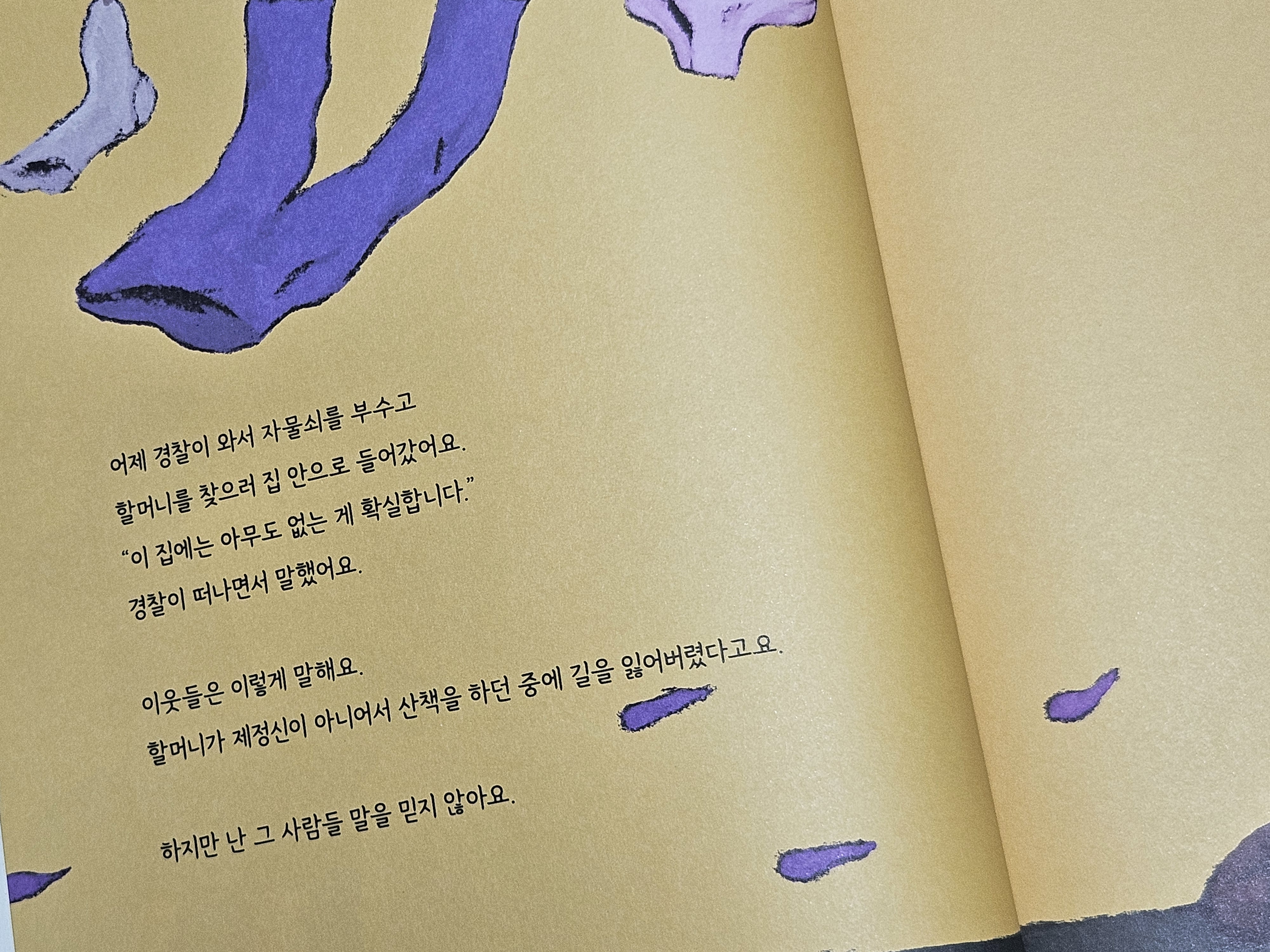 우리 이웃에 관한 무관심이 순수하게 삶을 살아가고 있었던 할머니에 관한 편견을 만들고 무관심을 만든 게 아닌가라는 생각이 더욱더 드는 마지막 모습이었습니다. 이 그림책을 어떻게 보면 아이들과 읽기에는 주제가 무거울 수도 있을 거란 생각도 들지만, 최근 많이 문제가 되고 있는 사회적인 문제이기 때문에 주변의 어르신들을 많이 보게 되는 아이들과 더 일찍 나눌 수 있는 주제라는 생각이 들었습니다.