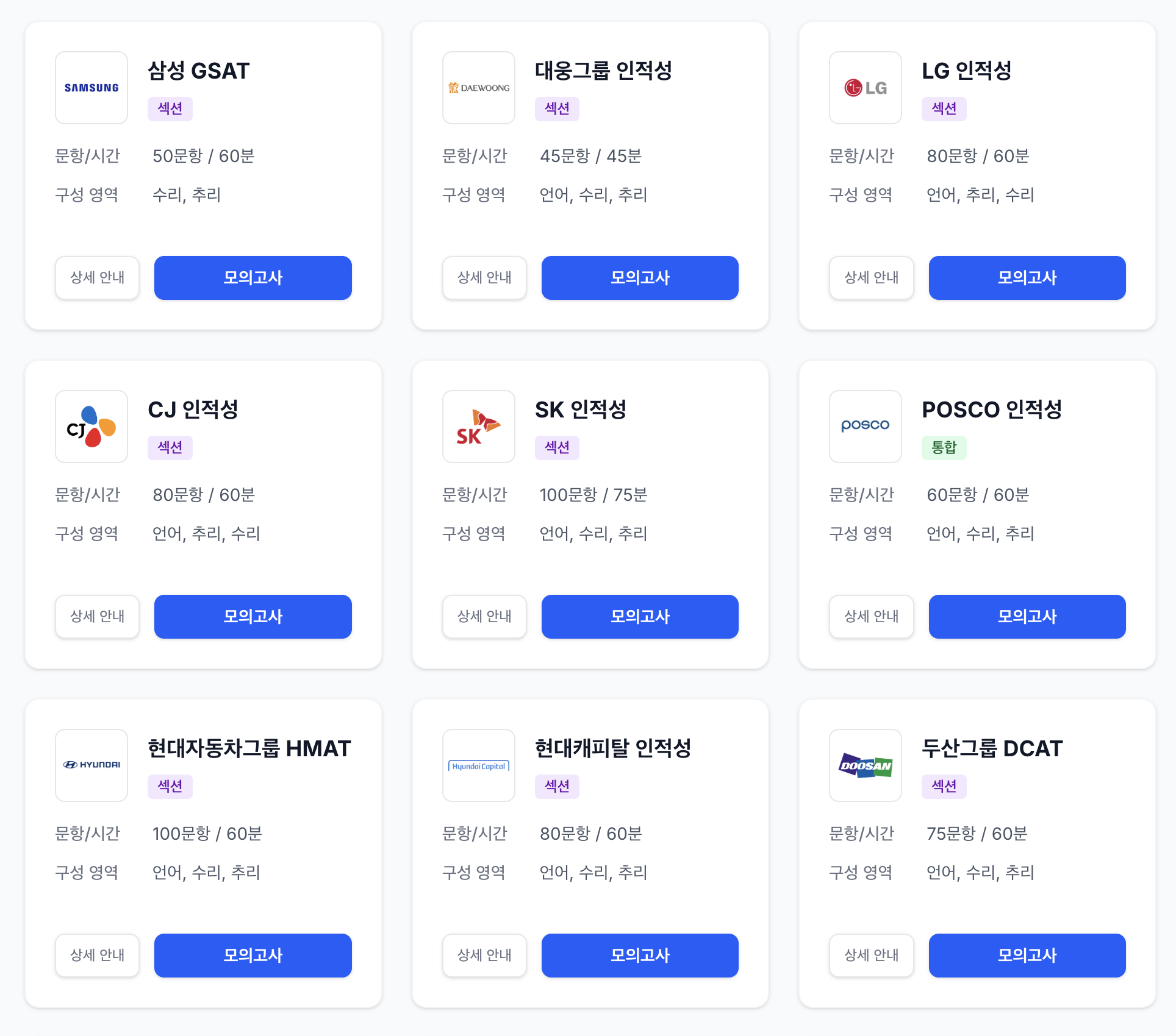 주요 대기업 인적성 검사 실전을 위한 최적의 모의고사 플랫폼. 바로 실력 점검을 시작하세요.
